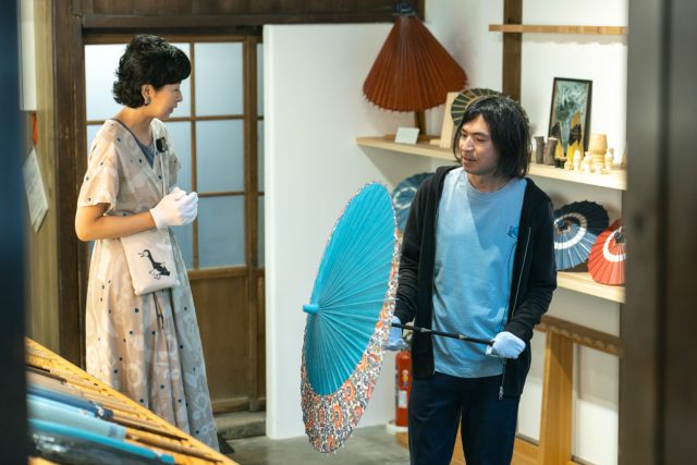 「和傘CASA」は、岐阜市の伝統工芸品である岐阜和傘の全国唯一の専門店。およそ60本もの和傘がずらりと並びます。ふかわさんも、店長の河口郁美さんから説明を受けながら和傘を広げ、細部にまで宿る手仕事の美しさにじっくりと見入っていました。