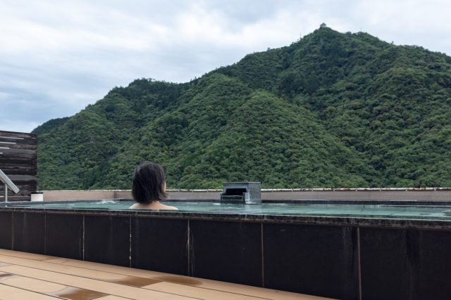 屋上露天風呂からは、長良川や金華山の景色が一望できます。ふかわさんもその絶景に感激。露天風呂に浸かりながら、ゆったりと雄大な眺めを堪能していました。