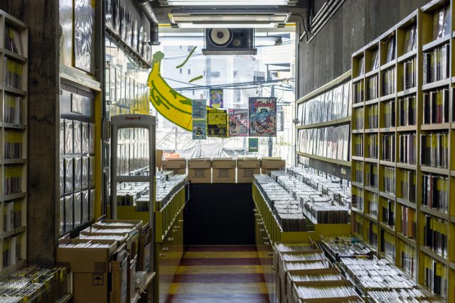 CDやレコードがびっしりと並ぶ黄色い棚と、窓に描かれた大きなバナナのイラストが目を引きます。