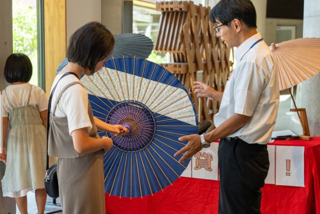 メディコスの魅力は本だけではありません。さまざまなイベントやワークショップも開催されています。この日は、岐阜市が主催する事業として、2か月に1回、岐阜市の伝統工芸品「岐阜和傘」が無料で借りられる体験イベントが行われていました。