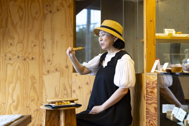 店内の一角にある「あんたきば」は、まっちんさんの工房として設けられたスペースで、不定期でつくりたての和菓子を販売しています。この日は季節限定の「あんみつ」の販売日。もちろん甲斐さんも購入し、早速食べてみることに。