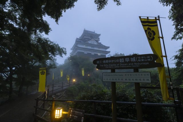 織田信長が天下統一の拠点とした岐阜城。信長がこの地方一帯を平定した際に「岐阜」という地名を名付けたことはよく知られています。そんな歴史に思いを馳せながら階段を登っていくと、霧の中にぼんやりと岐阜城が浮かび上がってきました。