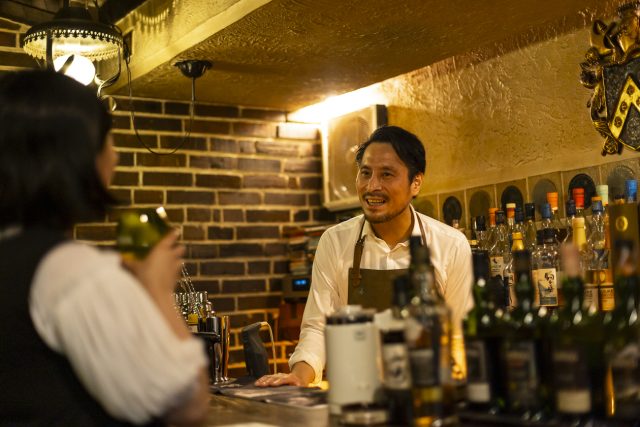 金華山からの夜景を楽しんだ後、1日目の締めくくりとして訪れたのは、茶色いレンガ造りの建物が印象的な「貿易風ミグ」。1951(昭和26)年に創業された「Bar貿易風」を現マスターの湯沢久雄さんが2014(平成26)年に引き継いで営業しています。