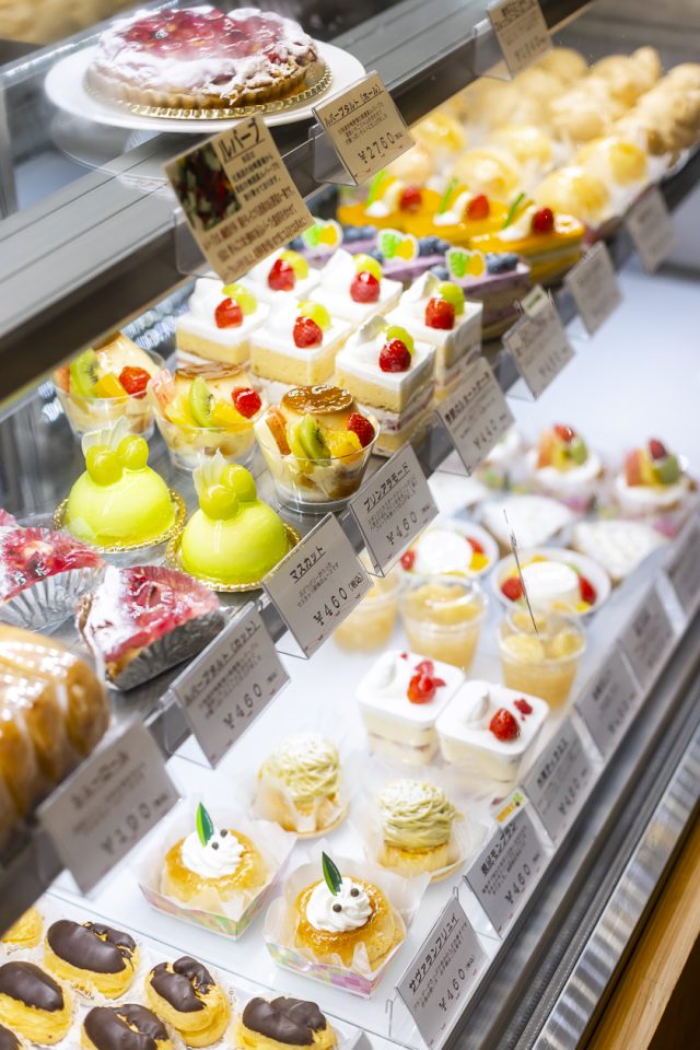 ショーケースには、いちごのショートケーキやフルーツタルトといった色とりどりのケーキ、シュークリーム、可愛らしい手のひらサイズの「プティエクレア」などがずらり!