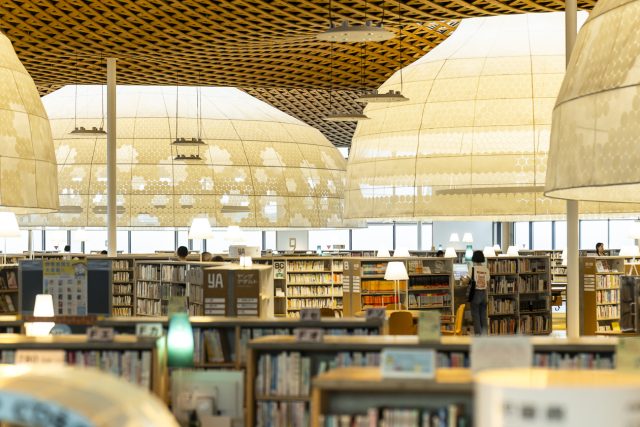 2階の図書館へ上がると、 “波打つ天井”と呼ばれる、岐阜市の山並みをイメージしてデザインされた木製の格子屋根と、天井から吊るされた大きな傘のような“グローブ”が視界に飛び込んできます。