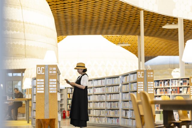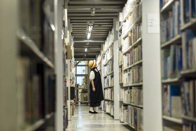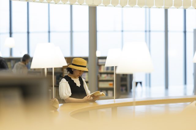 この日はあいにくの雨でしたが、むしろ図書館でゆったりと過ごすにはぴったり。甲斐さんは1階にある「本の蔵」にも足を伸ばします。
