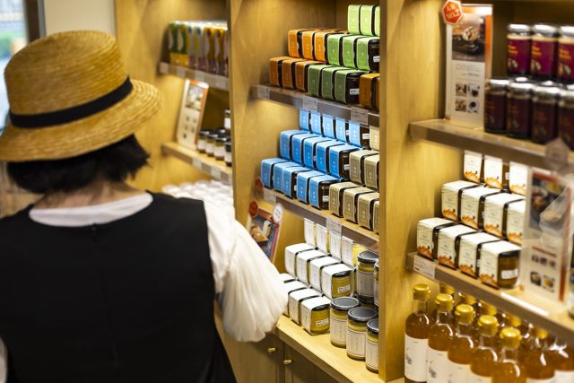 店内にはアカシア、れんげ、さくらなど、さまざまな花から集められた国産はちみつが並ぶほか、はちみつバター、はちみつを使ったスイーツなど、多種多様なオリジナル商品が並び、甲斐さんもじっくりと吟味しながら買い物を楽しみます。