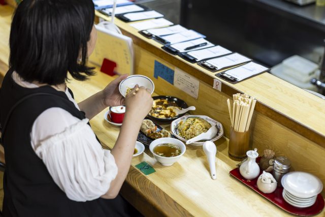 名物のギョーザをはじめ、炒飯、エビ料理、丼、麺、焼きそばなど、幅広いラインナップの中から、甲斐さんは人気の「ミックスギョーザ」や「麻婆豆腐」を選びました。