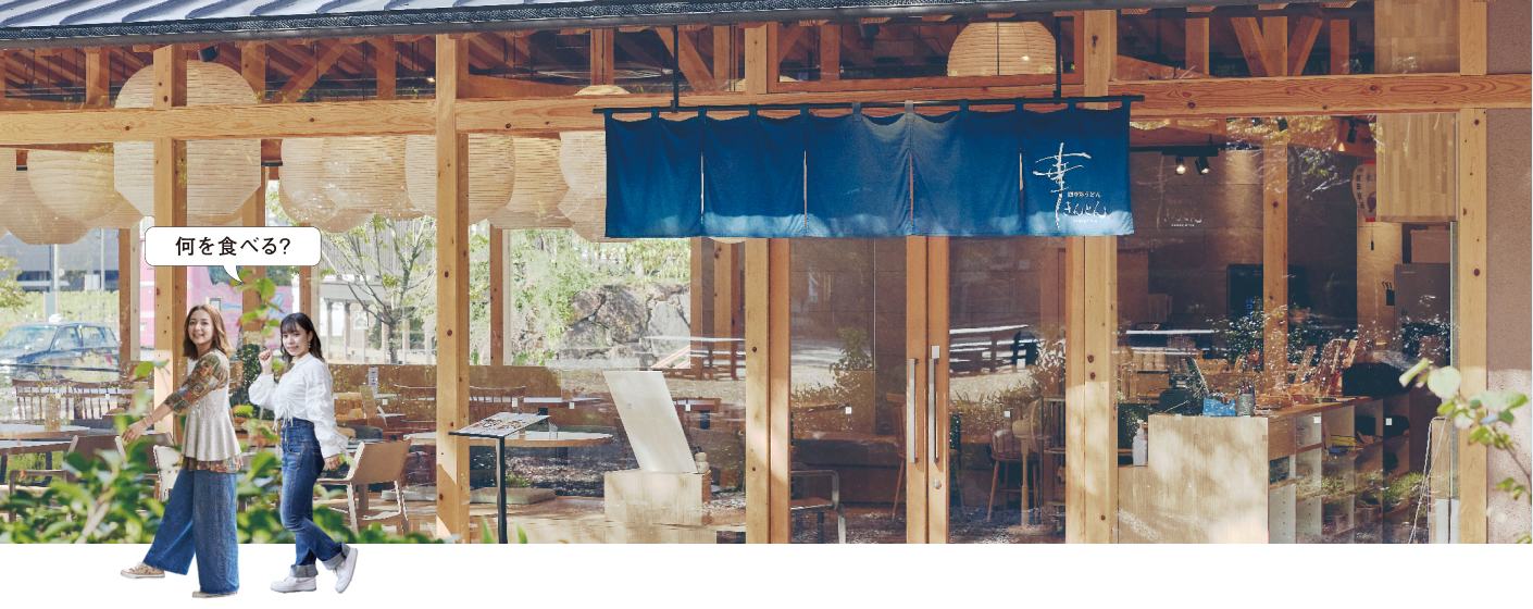 自社製麺所で作るこだわりのうどんと、出汁が香るおこわ、色とりどりのお惣菜が人気の和食レストラン。岐阜県産の提灯を飾った店内でゆったりと食事を楽しむことができる。