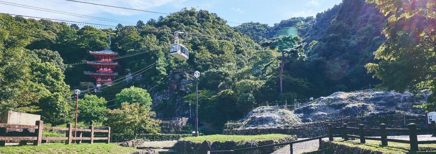 冠木門をくぐり、緑に囲まれた一帯を歩くと、信長公がこの地を治めていた当時の雰囲気を感じることができます。居館跡は、岩盤を加工した庭園や巨石を使用した石垣 が壮大で、目の前で見るとかなりの迫力です。